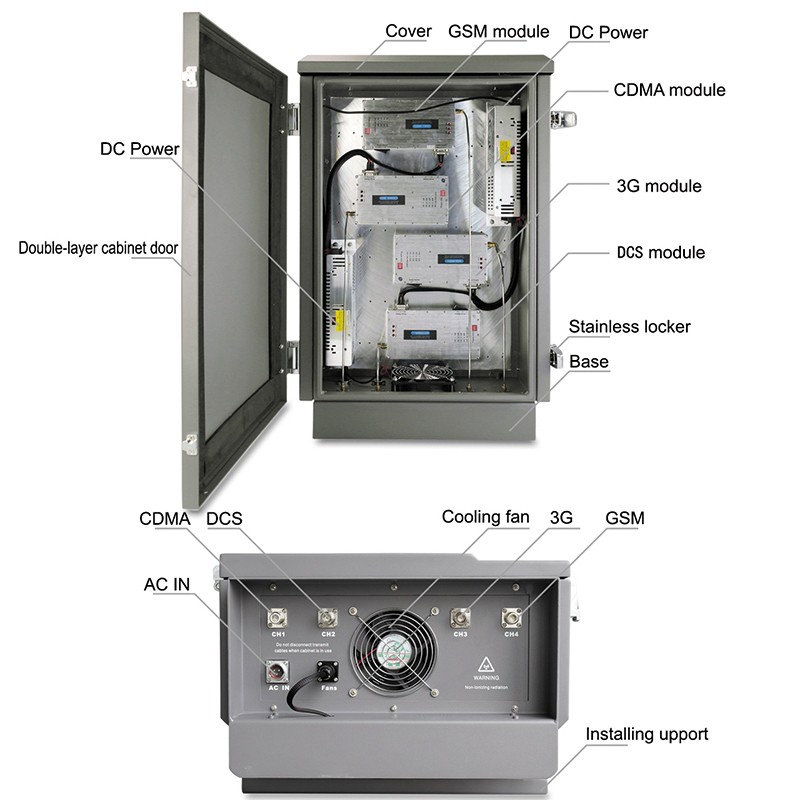 此款室外固定式防水大功率手機(jī)信號屏蔽器是我廠采用國外先進(jìn)技術(shù),針對主要針對邊境、部隊、監(jiān)獄、大型聚會場所中手機(jī)所帶來的不安全隱范,根據(jù)國內(nèi)外移動通信實際情況精心研制成功的高科技產(chǎn)品,它能在較大的范圍內(nèi)隔斷GSM/CDMA/DCS/PHS/3G/4G/5G等手機(jī)信號(或WIFI/Wimax等各類通訊信號),使手機(jī)無法打出和接聽及無線信號發(fā)截斷,但又不會干擾其它電子設(shè)備工作。